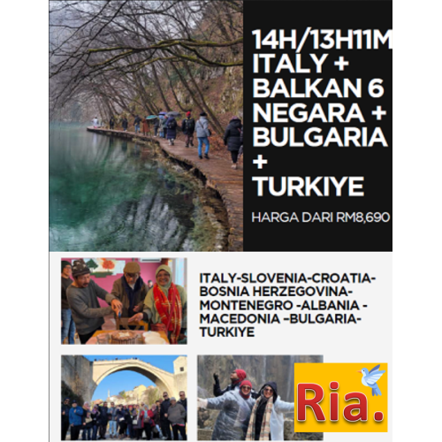 Tempat Lawatan:ITALY- SLOVENIA- CROATIA BOSNIA HERZEGOVINA MONTENEGRO -ALBANIA - MACEDONIA –BULGARIA TURKIYE | Skim Bayaran Mudah dari RM203/bulan x 48 bulan